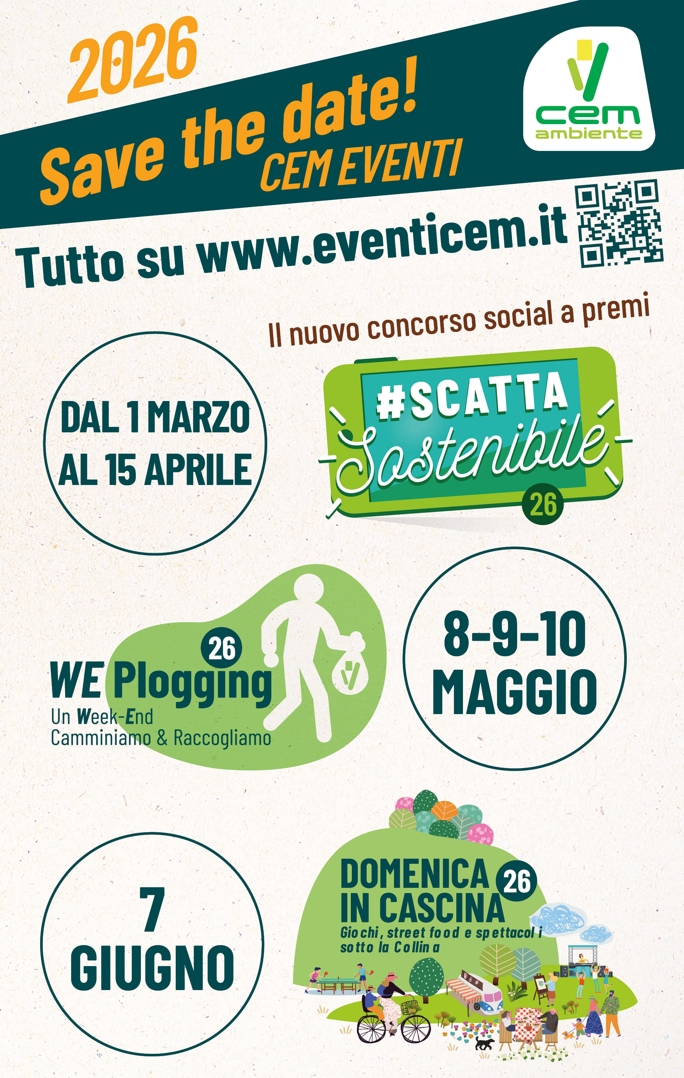 Un nuovo concorso foto/video a premi, attivo dall’1 marzo al 15 aprile 2026. Scoprite tutti i dettagli su www.eventicem.it/scattasostenibile - We Plogging 2026